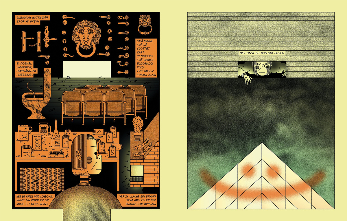 Teksten er korte og konkrete setninger, oppstykket på sidene slik innholdet i dem også springer mellom detaljer og overblikk. Tegningene er derimot overlessete. Torpe bruker en rad ulike teknikker, fra stiliserte strektegninger og abstrakt grafikk til 3D-modellerte objekter. Mange av grepene minner om virkemidler vi kjenner fra internasjonale indie-tegneserier, men det er en imponerende allsidighet og eksperimentvilje Torpe viser. Han fyller på med referanser til kunstnere som Kittelsen og Botticelli.