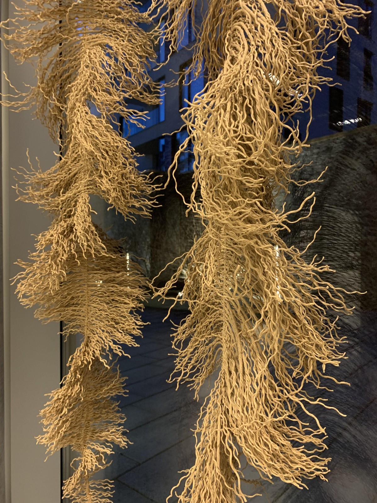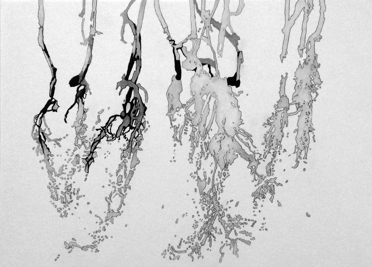 Det er tegningene som skal være i fokus her; skjønt det er vanskelig å komme utenom utstillingen som helhet. I vinduet henger store, naturnære former med tittelen Growing flettet eller knyttet sammen av papirhyssing; raffinert og finurlig, et særdeles avansert håndarbeid. Det upretensiøse materialet, nærmest spartansk i uttrykket, den tørre gråpapir-fargen, gir dem en slående likhet med visnende bregner, fanget i det kontemplative stadiet av tilværelsen. Råmaterialet – papir – er som kjent en kultivert, sterkt bearbeidet utgave av treet, det opprinnelige utgangspunktet.
