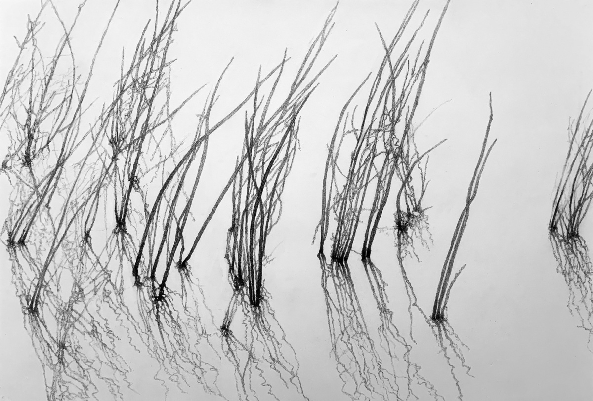 Det er likevel noe drømmeaktig over disse blyanttegningene – det er et hukommelsesarbeid; man kunne kalle det impresjonistisk i sin karakter. Hun tegner siv som kaster forsiktige skygger i sand eller snø – ubestemmelige nøster av fibre som får et grafisk, men ikke abstrakt uttrykk. Forvitrete planter, nærstudier av sårbarhet – nærmest som gjenferd står de fram i en historie fra naturens kretsløp. Titlene viser til stadier av værbitthet, de visne blomstene har hatt sin gode sommer. Nærstudiene av røtter viser en velkommen annerledes modus, der det er vekst og styrke – de er intrikate eksempler på både tegnerens og naturens utholdenhet – utført med forsiktighet, men med nødvendig mørke og temperament.