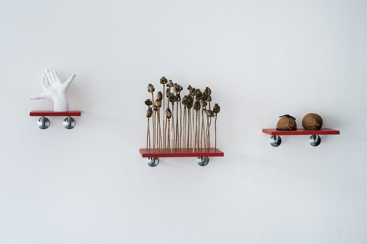 Også når det gjaldt sjanger og uttrykk, var denne utstillingen svært allsidig. I tillegg til tegningene besto utstillingen blant annet av et interaktivt lydverk, performance, en menneskelignende plasthånd med sju fingre og organiske objekter i form av «sko» laget av kokosnøtter ved siden av pent oppstilte valmuefrøkapsler. Valmuen gikk også igjen som tegnet element, og sammen med 43 opphengte notatbøker hvor kunstneren hadde skrevet ned utdrag fra drømmene sine, var valmuesymbolikken med på å befeste utstillingens deliriske tematikk. Det er nemlig fra valmuefrø vi får rusmiddelet opium, og dermed også morfin. Som nettopp en slags billedliggjøring av drømmer som fenomen, synes jeg utstillingen maktet å gjenskape følelsen av virkelighetsforskyvning og opphøring av kontroll som skjer når man drømmer. Dreams and Other Important Stuff besto ellers av mange elementer – både visuelle, auditive og taktile – som vekket nysgjerrighet og interesse hos meg som betrakter. På grunn av en lekkert gjennomført og, påfallende nok, sober montering fremsto utstillingen likevel helhetlig og stram i formen.