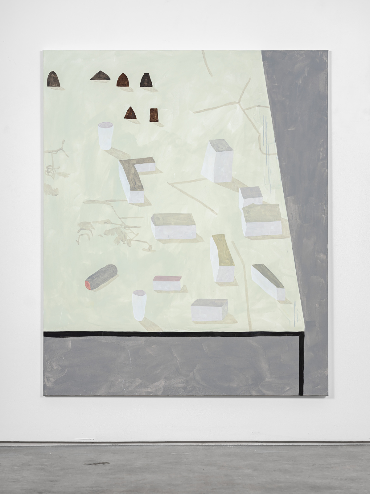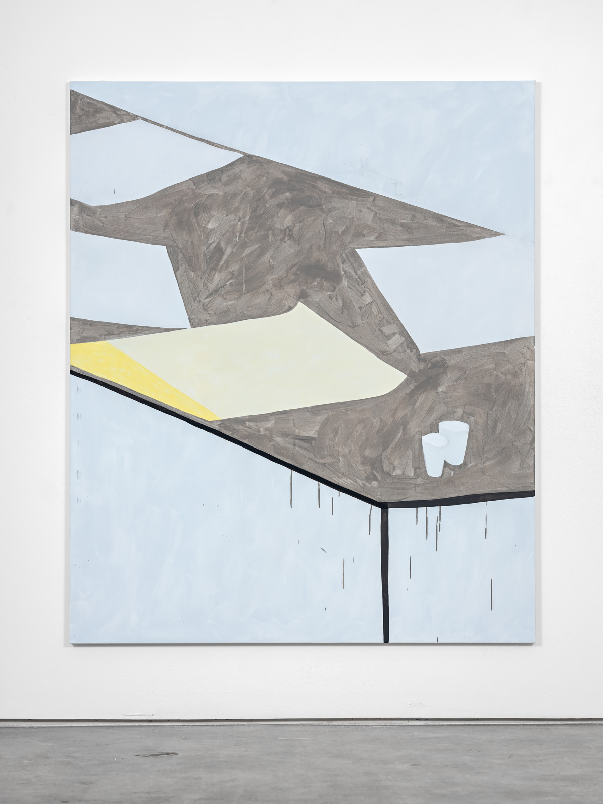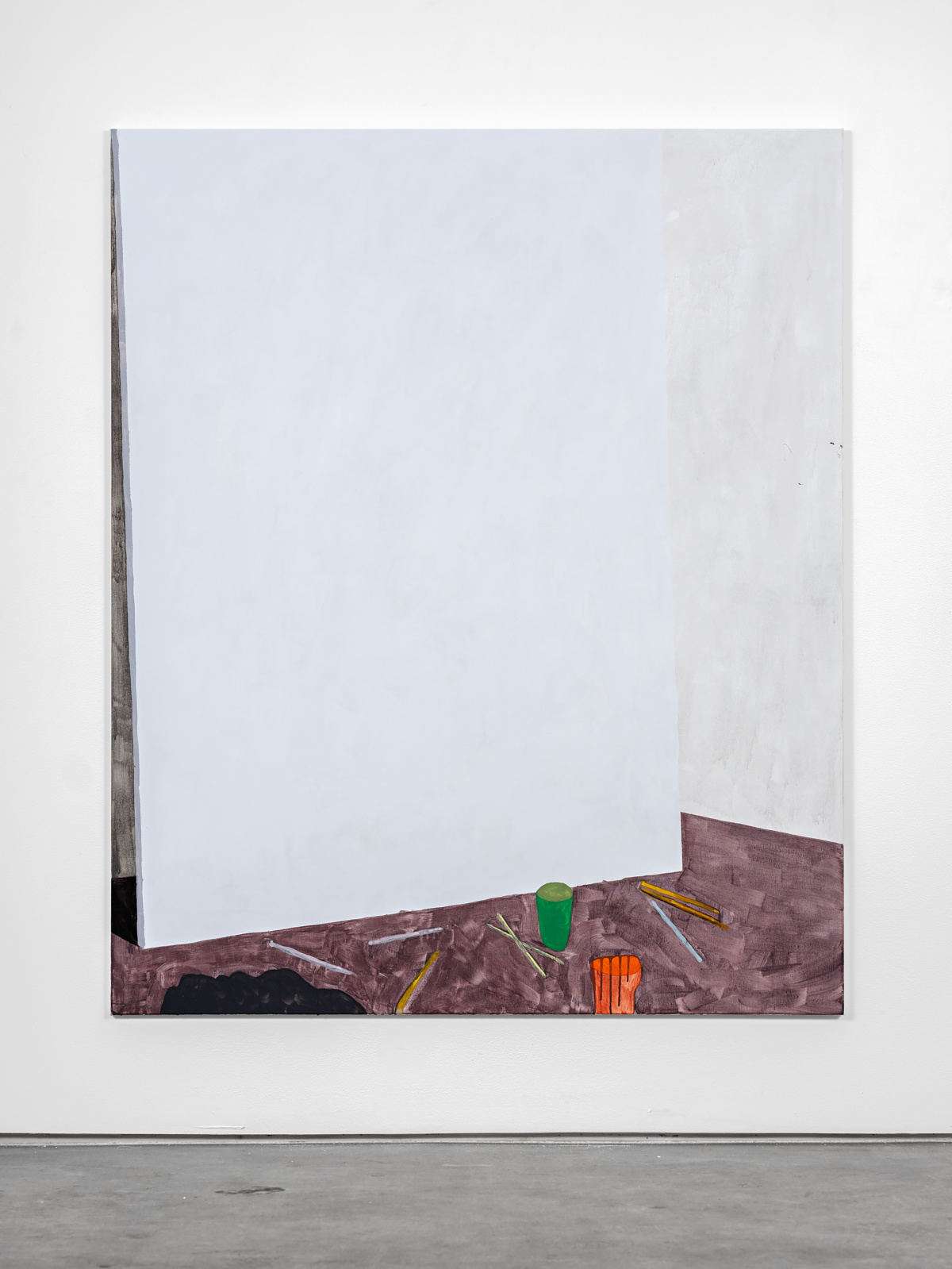 Det førstnevnte bildet viser et tomt, skråstilt lerret sentralt plassert i bildeflaten med en mengde tomme, buklete, gråhvite og gule plastkopper, noen stående, noen liggende, i forgrunnen av bildet. Underlaget lerretet i bildet hviler på, er brunrødt, og veggene er holdt i gråtoner. Det er lett å anta at det har forekommet mye nervøs slurping rundt tømmingen av disse koppene mens motoren har gått på tomgang i atelieret, for å uttrykke det litt miljø-uriktig. I «It’s Not Funny, I Don’t Know Why I’m Laughing» ligger en rekke tommeltotter (er det kanskje ti?) rundt en lang, negleløs langfinger i en krok av gallerirommet. I maleriet «Passive Administration» ligger ark som kunne ha vært brukt til skisser, slengt tilsynelatende uvørent rundt om på et bord med tynne, svarte bein, og i både «Too Slow to Disco» og i «Show-in-Show» figurerer arbeidsredskaper Hiorthøy behersker til fulle: blyanter. De ligger i beredskap både foran lerretet og ved siden av arkene, som påminnelser om at det finnes veier ut av «malerihelvetet». Hiorthøy er for øvrig ikke den første kunstneren som ser ut til å føle seg tynget av den århundrelange maleritradisjonen, diskusjonene rundt maleriets legitimitet og samtidsscenens forventninger om at malere til enhver tid skal stå i en dialog med et nettverk av andre malerier og verden rundt seg. I våre dager, når mediehierarkiet i prinsippet er oppløst, er det imidlertid liten grunn til at det å male skulle oppleves som mer tyngende enn det å produsere kunst av annen art. Likevel er virkeligheten en annen, slik Hiorthøy demonstrerer gjennom den aktuelle utstillingen.